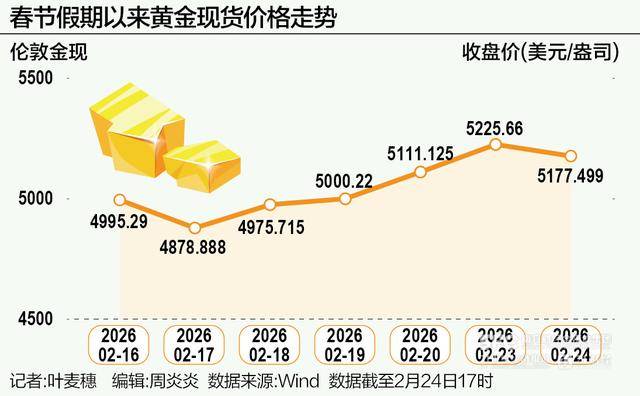 具体来说, 黄金现货价格在2月16日、17日连续两日下跌,随后因美国贸易政策的不确定性以及伊朗局势持续紧张,促使投资者转向更安全的资产,2月18日至23日又连着5日上涨。