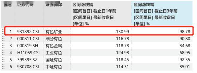 从历史表现来看,有色金属矿业指数近一年涨幅达131%,近三年涨幅99%,在主流有色指数中位居第一。