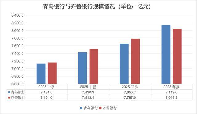 这种情况一直持续了三个季度,令人意外的是,2025年收官,青岛银行一举冲刺,再度夺回山东银行“一哥”的位置。截至年末,青岛银行的资产规模为8149.6亿元,相比齐鲁银行8043.8亿元的规模领先百亿元。
