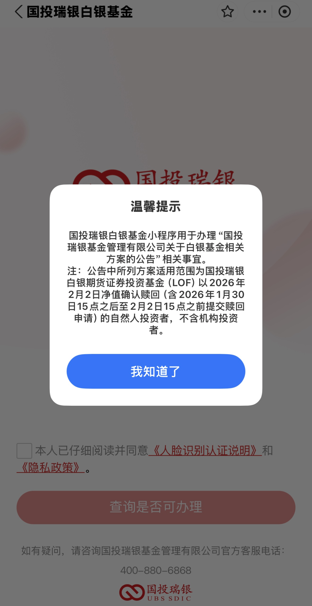 根据国投瑞银基金发布的公告,投资者即日起可通过支付宝搜索“国投瑞银白银基金”小程序,按照提示完成身份验证后,在线办理补偿事宜。