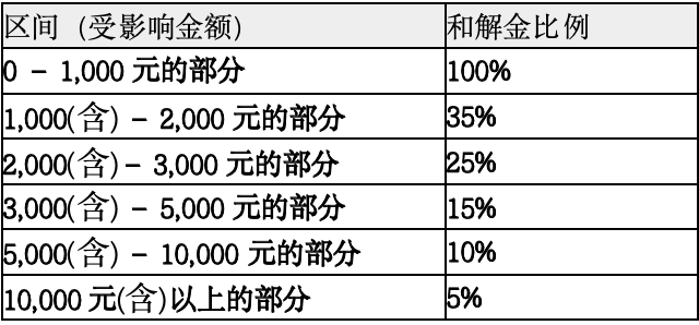 对估值调整影响金额(由-17%调至-31.5%的部分)超过1000元(含)的自然人投资者,在1000元基础上加上超1000元部分乘以一定比例确定总和解金额:1000元(含)至2000元的部分按35%比例补偿,2000元(含)至3000元的部分按25%比例补偿,3000元(含)至5000元的部分按15%比例补偿,5000元(含)至10000元的部分按10%比例补偿,10000元(含)以上的部分按5%比例补偿,各段补偿金额之和即为投资者可获得的总和解金额。
