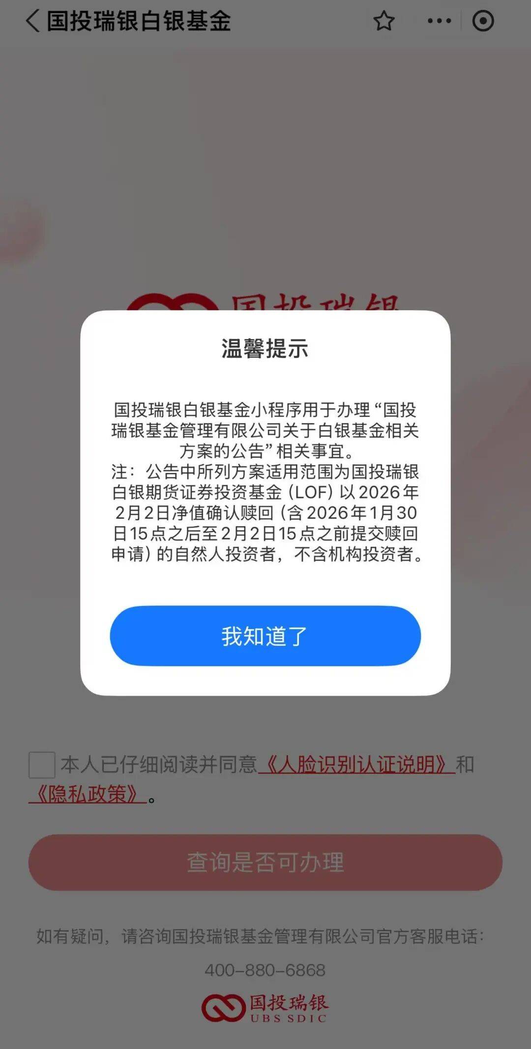 界面新闻在支付宝上找到该小程序,上面显示“用于办理国投瑞银基金管理有限公司关于白银基金相关方案的公告”相关事宜。截至目前,该小程序已经有1万多人使用。