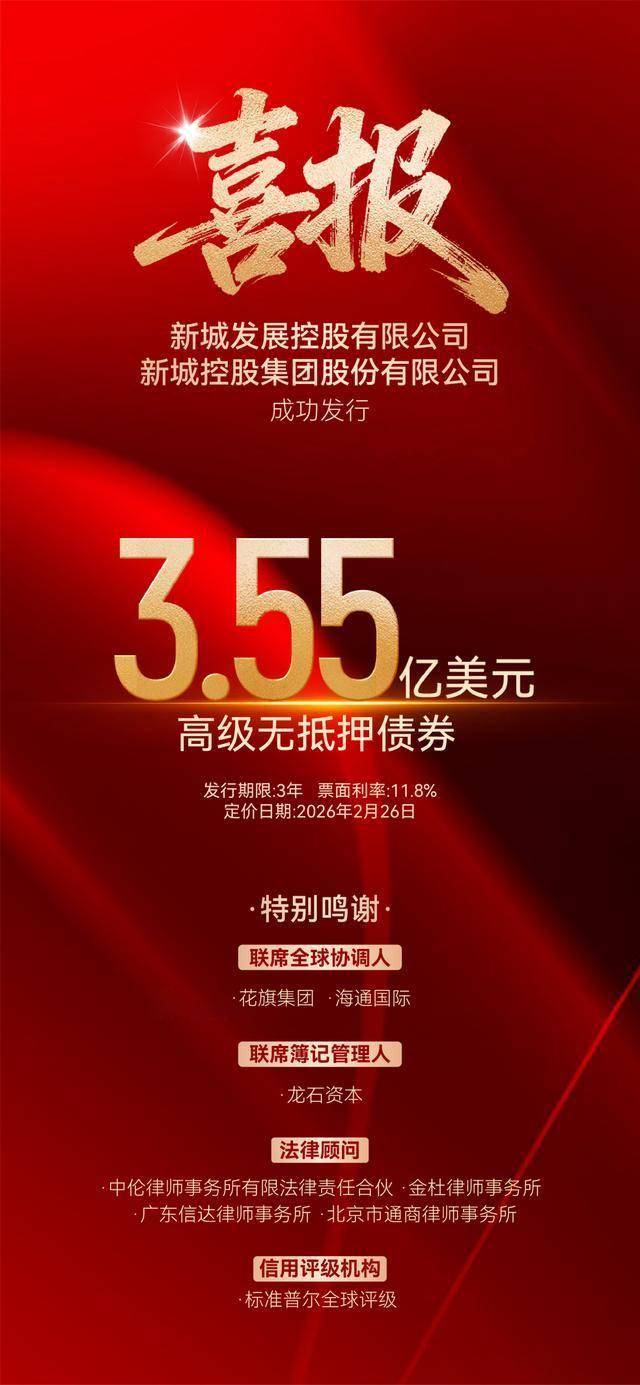 乐居财经 李兰2月26日,据新城控股官微,新城发展控股有限公司(以下简称“新城发展”)、新城控股集团股份有限公司成功发行3.55亿美元债。