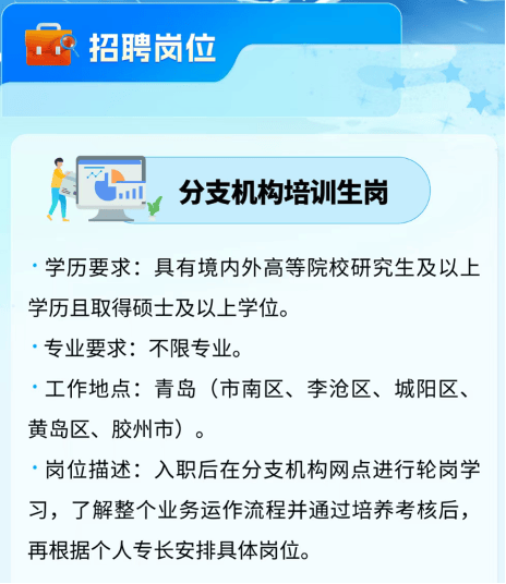 也是在2月25日,青岛农商银行的2026年校园招聘也在相关账号公告。据悉招聘岗位包括分支机构培训生岗、综合柜员岗、微贷中心客户经理岗。