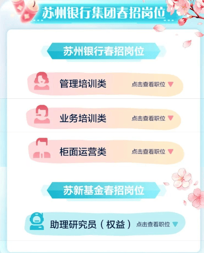 作为实力城商行,苏州银行此次春招也推出了不少好岗位。包括了管理培训类、业务培训类、柜面培训类,以及苏新基金的助理研究员(权益)岗位等,虚席以待迎接才俊。