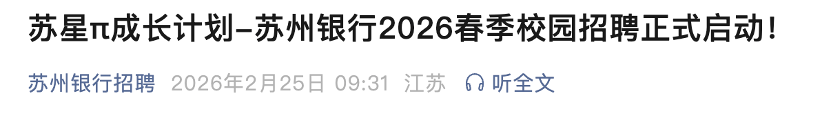 节后开工的第二天,2月25日,苏州银行在第一时间发布了2026年春季校园招聘正式启动的消息。