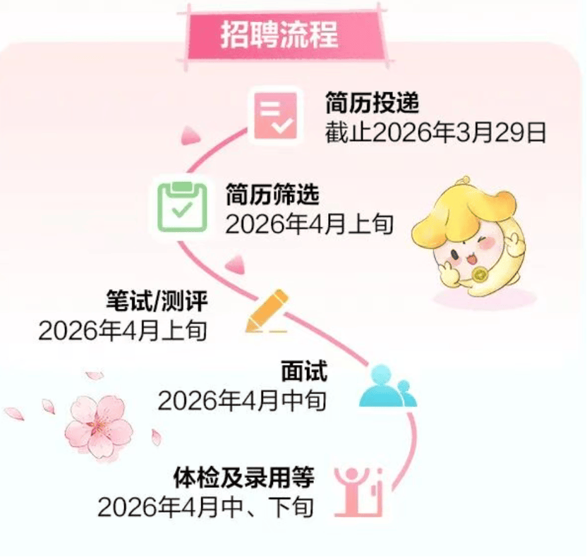 以苏州银行公布的招聘流程为例,简历投递截止2026年3月29日,4月上旬就进行简历筛选和笔试/测评,4月中旬面试后,中下旬就进行体检及录用流程。