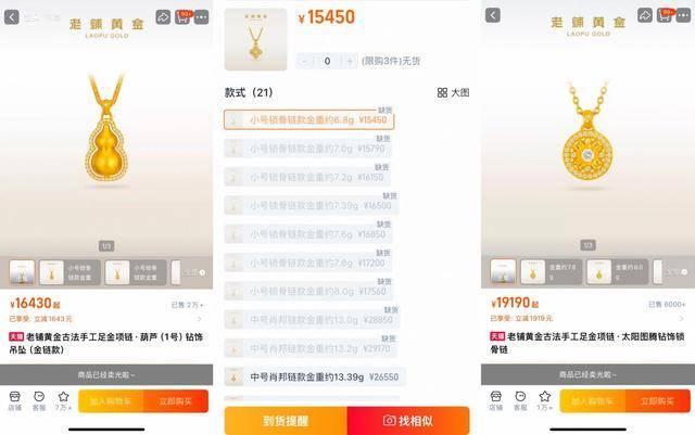 财闻注意到,在老铺黄金天猫旗舰店,其热门的葫芦(1号)钻饰吊坠、十字金刚杵的小号项链等商品均已售罄。