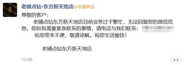 此外,位于王府井商圈的老铺黄金东方新天地店方也在企业微信上发布了“过于繁忙,无法回复微信信息”的朋友圈。