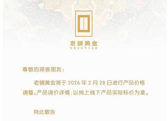 近日,老铺黄金发布调价通知,宣布将于2026年2月28日进行产品价格调整。产品价格详情,以线上线下实际标价为准。