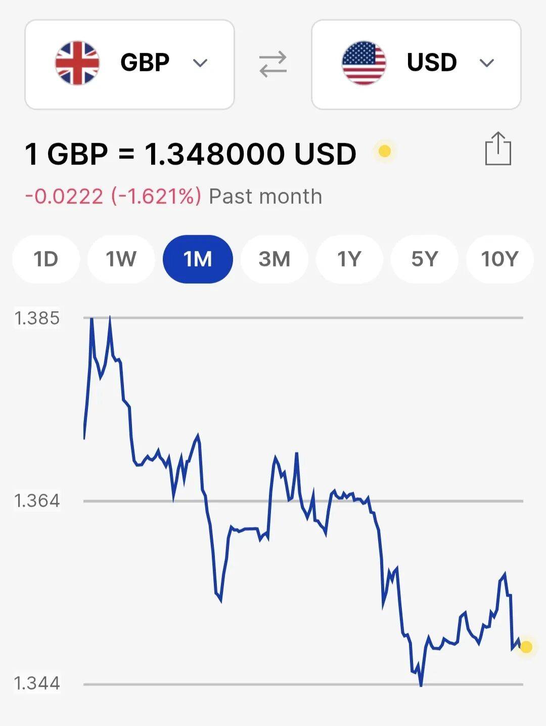 具体汇率方面,受上述消息影响,英镑兑美元汇率在过去24小时一度跌1.345,最新汇率为1.348。