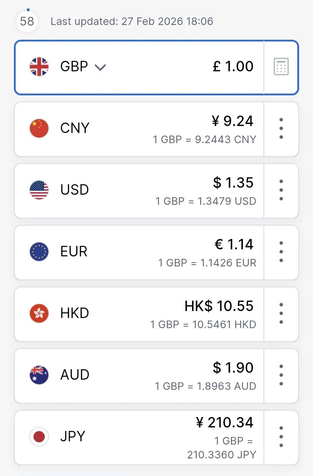 截至发文时(2026年2月27日),英镑最新汇率情况如下: