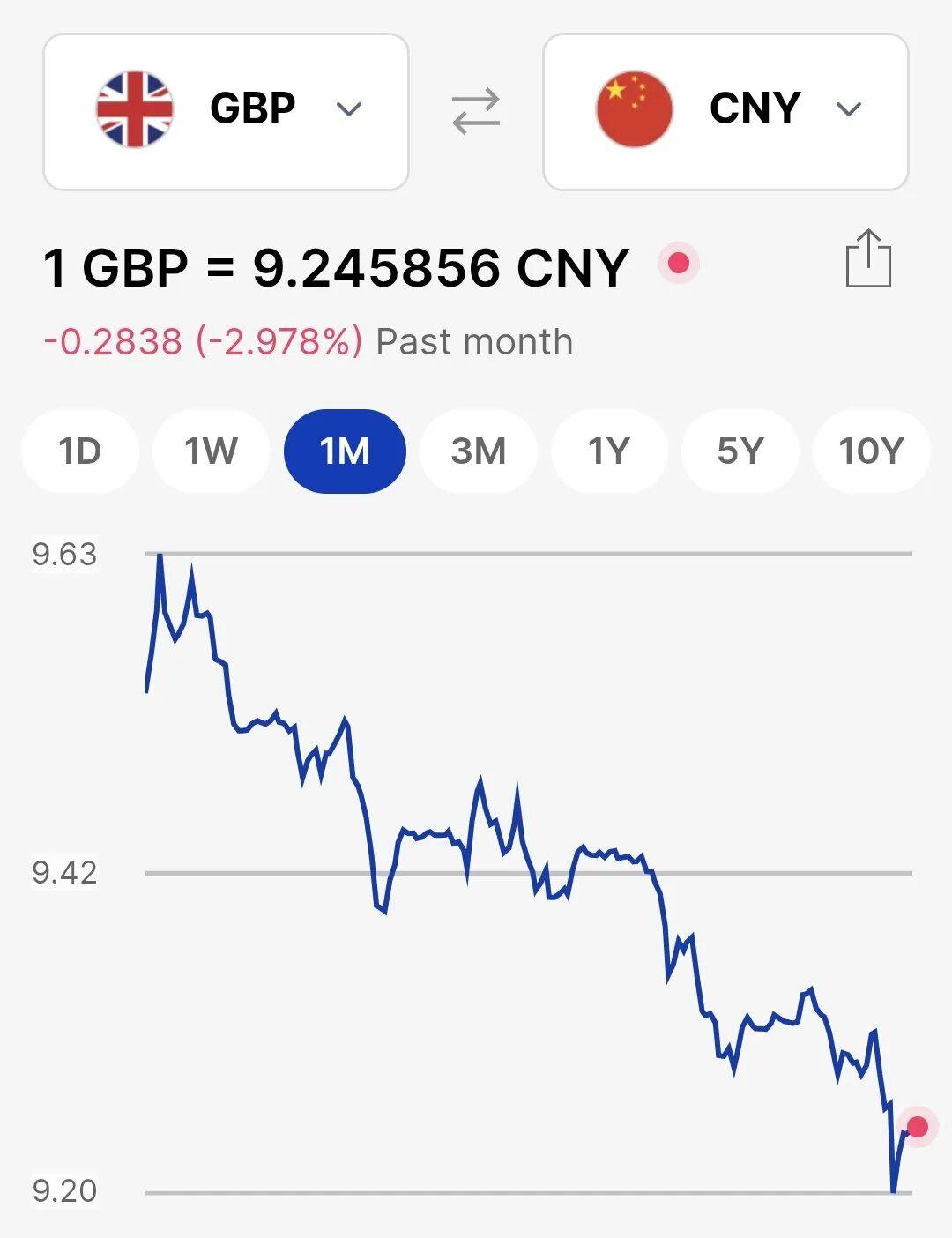 英镑兑人民币汇率同样在今天一度跌到9.20,目前最新汇率为9.24。