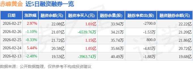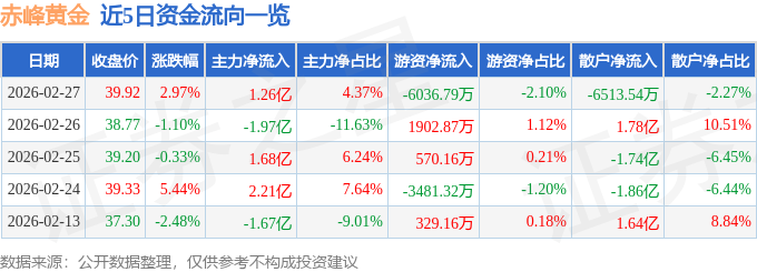 证券之星消息,截至2026年2月27日收盘,赤峰黄金(600988)报收于39.92元,上涨2.97%,换手率4.38%,成交量72.88万手,成交额28.72亿元。