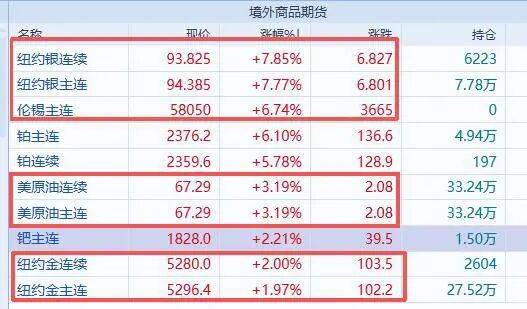 受此冲击,国际市场剧烈震荡,周五晚间, 纽交所旗下黄金、白银大幅拉升,COMEX白银盘中涨幅超8%,价格成功站上94美元/盎司关口,创一个月以来的新高;COMEX黄金涨幅近2%,价格逼近5300美元/盎司关口。此外,纽交所旗下铂主连亦涨超6%,钯金亦涨超2%。与此同时,纽交所旗下美原油价格亦出现拉升,上周五晚间盘中涨幅超3%,价格重返67美元/桶上方,创近半年以来的新高,年初至今累计涨幅超17%。
