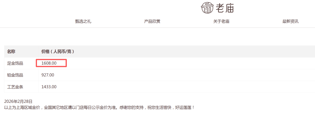老庙黄金报价1608元/克