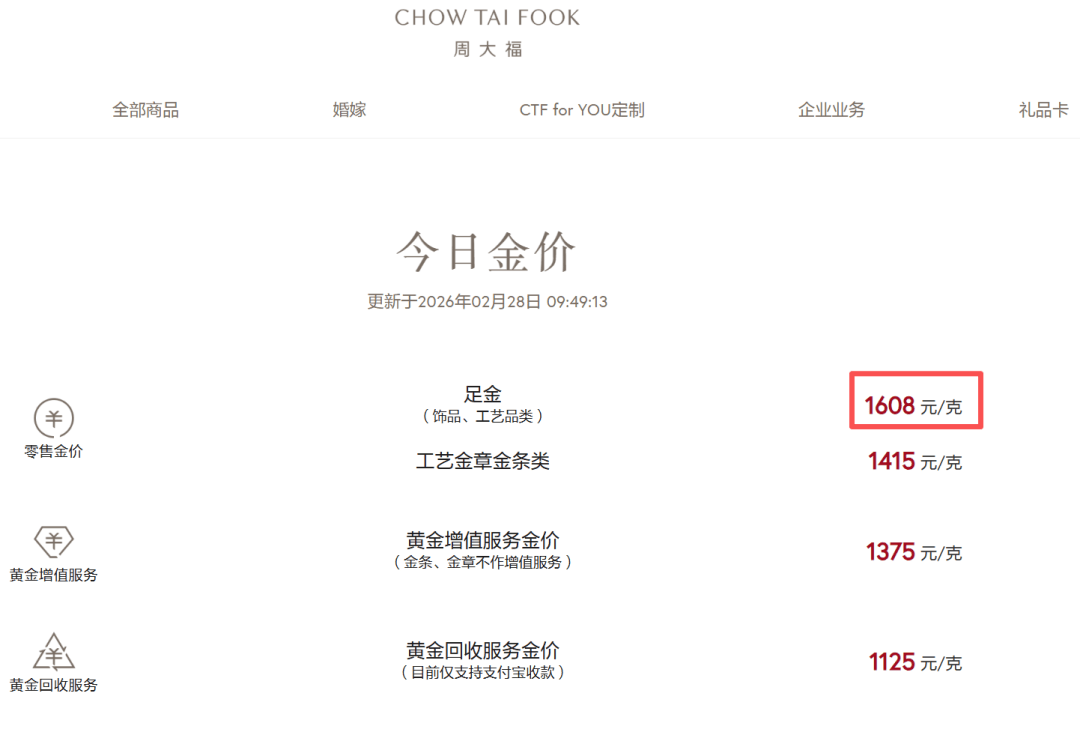 周大福报价1608元/克