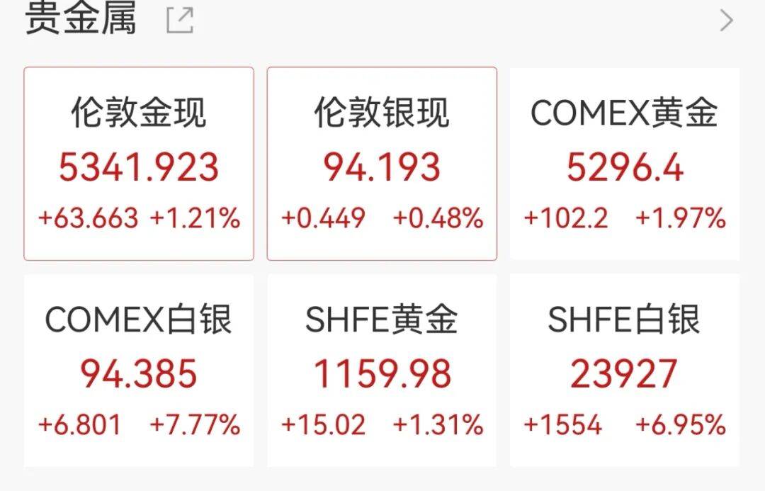 3月2日,受中东局势升级影响,避险情绪升温,周一金银全线高开。截至发稿,涨幅有所收窄,现货黄金上涨至5341美元/盎司,涨幅1.21%;现货白银报94美元/盎司,涨幅0.48%。COMEX黄金涨1.97%,COMEX白银涨7.77%。
