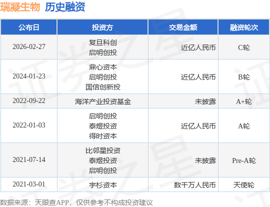 证券之星消息,根据天眼查APP于2月27日公布的信息整理,上海瑞凝生物科技有限公司C轮融资,融资额近亿人民币,参与投资的机构包括复旦科创,启明创投。