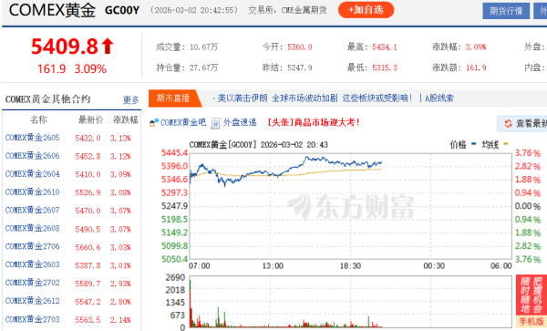3月2日,现货黄金、白银价格双双震荡飙升,COMEX黄金站上5400美元/盎司,COMEX白银达95美元/盎司。