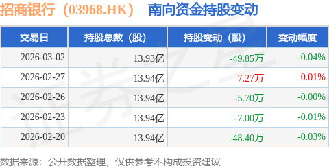 证券之星消息,3月2日南向资金减持49.85万股招商银行(03968.HK)。近5个交易日中,获南向资金减持的有4天,累计净减持103.68万股。近20个交易日中,获南向资金增持的有10天,累计净增持3603.01万股。截至目前,南向资金持有招商银行(03968.HK)13.93亿股,占公司已发行普通股的30.35%。