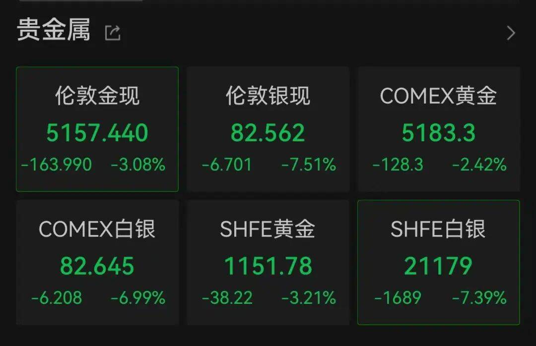 国际贵金属价格全线下跌。现货白银、现货铂金一度跌逾12%,现货钯金一度跌近7%,现货黄金盘中大跌逾4%。截至北京时间21:40,伦敦现货黄金跌3.08%,报5157.44美元/盎司;伦敦现货白银跌7.51%,报82.562美元/盎司。