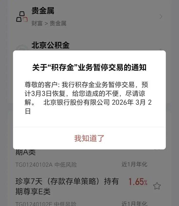 当日,北京银行通过手机银行推送《关于“积存金”业务暂停交易的通知》,宣布暂停积存金业务交易,3月3日恢复。