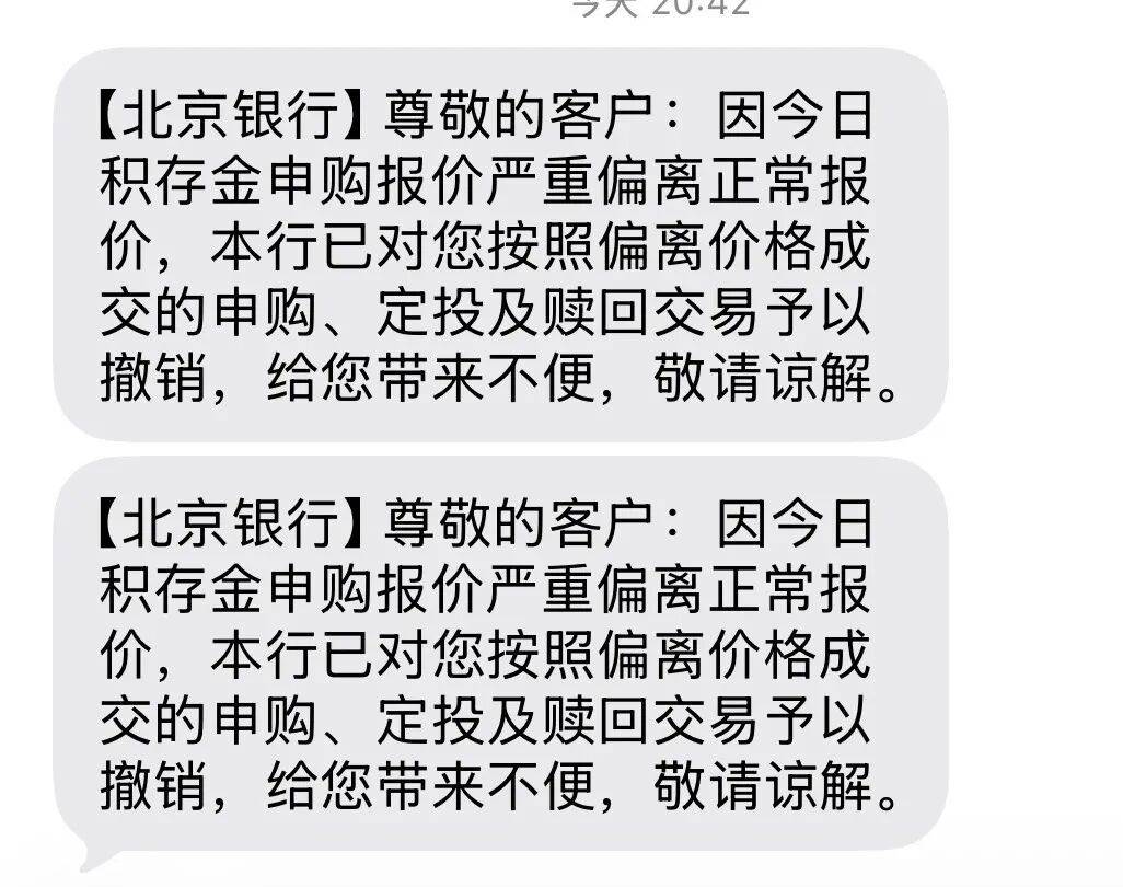 另有投资者展示的截图显示,20点42分,北京银行发送短信:因今日积存金申购报价严重偏离正常报价,本行已对您按照偏离价格成交的申购、定投及赎回交易予以撤销,给您带来的不便,敬请谅解。