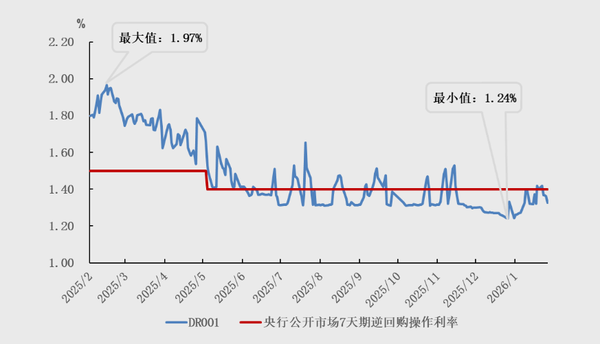 2026年1月,银行业存款类金融机构间利率债隔夜质押式回购(DR001)月加权平均利率为1.34%,环比上升6个基点;DR007月加权平均利率为1.51%,环比下降1个基点;银行间市场隔夜质押式回购(R001)月加权平均利率为1.41%,环比上升5个基点。2026年1月,DR001与央行公开市场7天期逆回购操作利率的利差日均值为-6个基点,R001与DR001的利差日均值为7个基点。