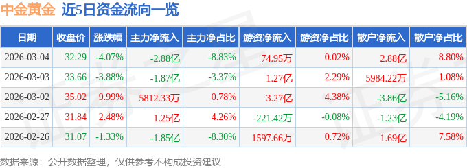 证券之星消息,截至2026年3月4日收盘,中金黄金(600489)报收于32.29元,下跌4.07%,换手率2.09%,成交量101.17万手,成交额32.68亿元。