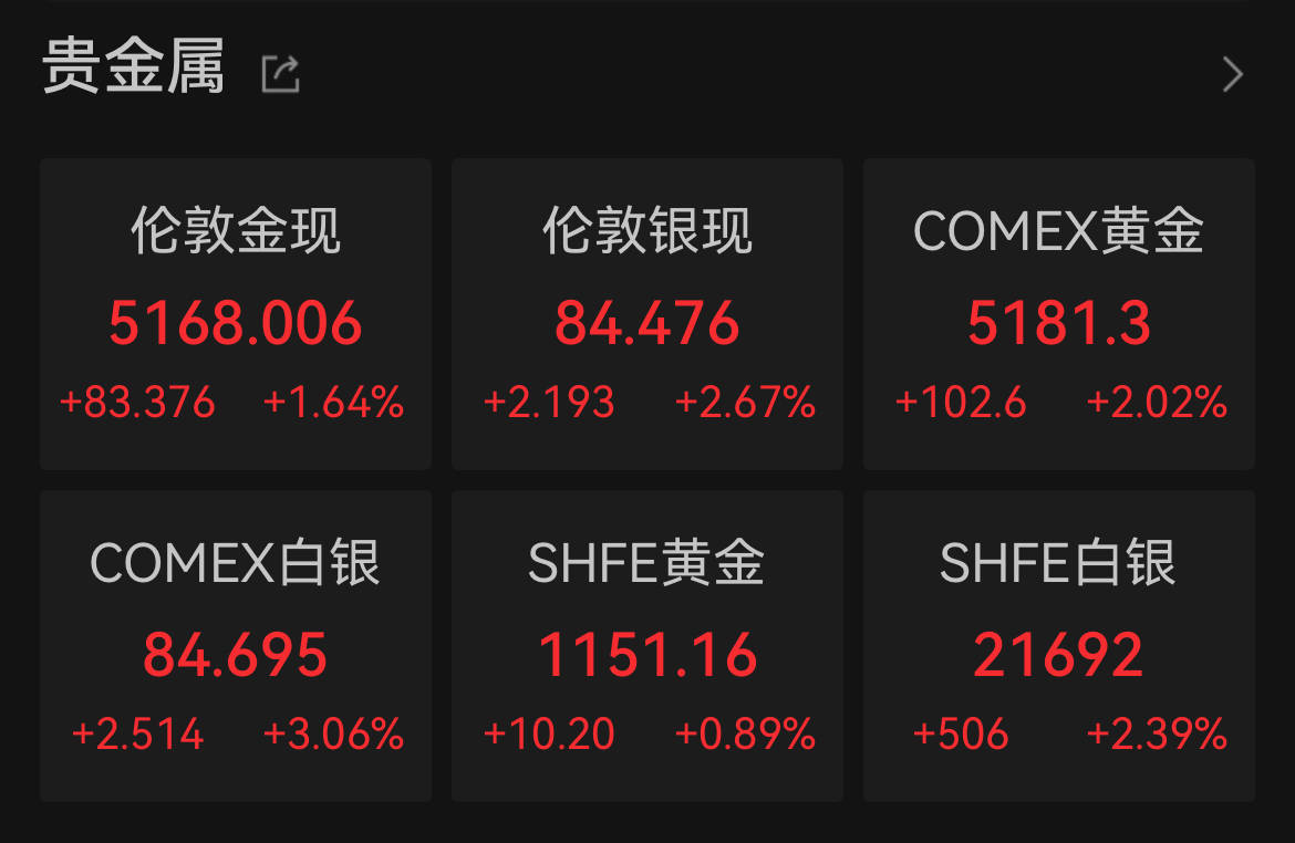 截至北京时间3月7日早间发稿,伦敦金现报5168美元/盎司,涨幅1.64%;伦敦银现报84.48美元/盎司,涨幅2.67%。此外,COMEX黄金报5181.3美元/盎司,涨超2%;COMEX白银报84.69美元/盎司,涨幅扩大至3%。