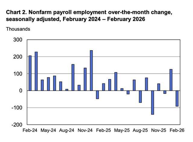 美国劳工部劳工统计局(BLS)周五发布的就业报告显示,2 月非农就业人数减少9.2万人,市场预期增加5.9万人;1月数据经下修后为增加12.6万人。与此同时,平均时薪环比增长0.4%,与1月增速持平,高于市场预期的0.3%。劳动力参与率降至62.0%,为2021年12月以来最低水平。家庭调查就业人数减少18.5万人,这是失业率从1月4.3%升至4.4%的主要原因。
