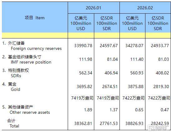国家外汇管理局公布的最新数据显示,截至2026年2月末,我国外汇储备规模为34278亿美元,较1月末上升287亿美元,升幅为0.85%。