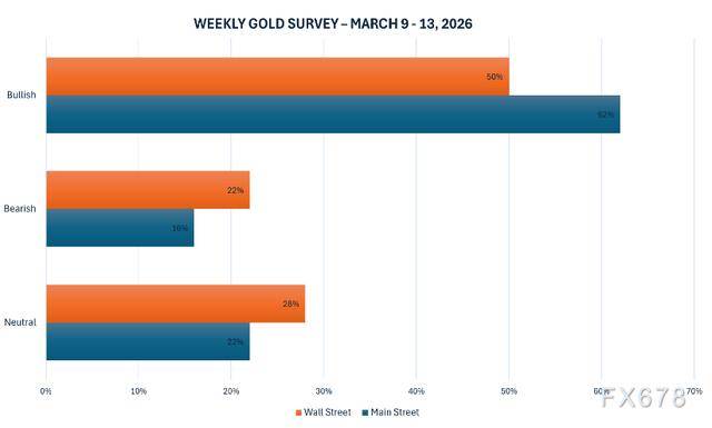 华尔街与主街分歧明显:50%分析师看涨后市,5000美元支撑“铁板一块” 本周Kitco新闻黄金调查显示,华尔街意见严重分裂:18位分析师中,9位(50%)预计未来一周金价上涨,4位看跌,其余持中性。主街投资者情绪则回暖至2月初水平,62%的零售交易者看好未来一周进一步上涨。