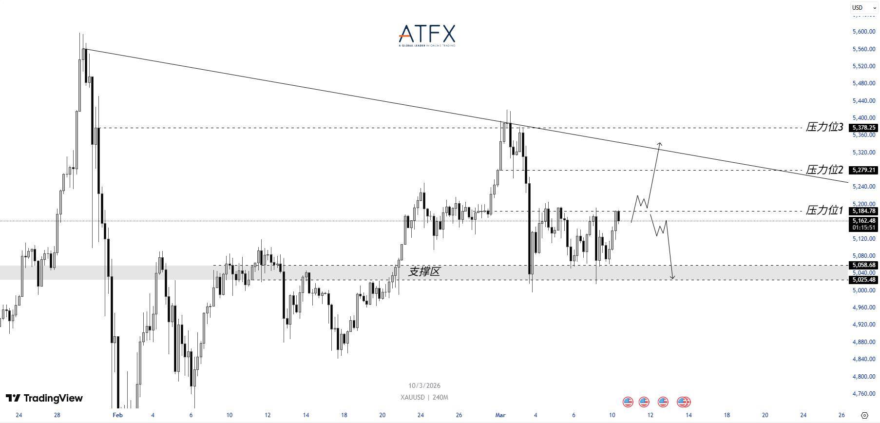 结合黄金的四小时技术图表观察,金价目前的走势结构呈现出典型的高位宽幅震荡与技术性修复特征。从图表中的趋势线来看,上方受到一条连接前期高点的斜向下降趋势线的严峻压制,这构成了中短期的技术“天花板”。目前,金价正处于压力位1(5184.78美元)的关键博弈点,若多头无法在此处放量突破,估计还会持续横盘整理。而下方的布局则更为关键,5025.48至5058.68美元区间被明确标记为核心支撑区。回溯此前行情,金价在下探至5015美元附近时迅速抽回,留下了明显的下影线,证明了5000美元大关上方存在着极为强劲的结构性买盘。