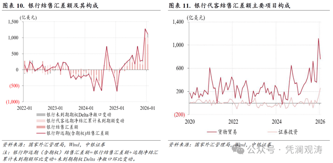 第二,境内外汇供求失衡状况加剧。如前所述,银行结售汇顺差在2025年12月创下历史新高后,2026年1月再度录得历史次高,顺差规模连续两个月超过千亿。2025年3月至2026年1月,银行结售汇累计顺差5131亿美元,仅用了11个月的时间就超过了此前20个月(2023年7月至2025年2月)积累的银行结售汇逆差4061亿美元(见图表10)。