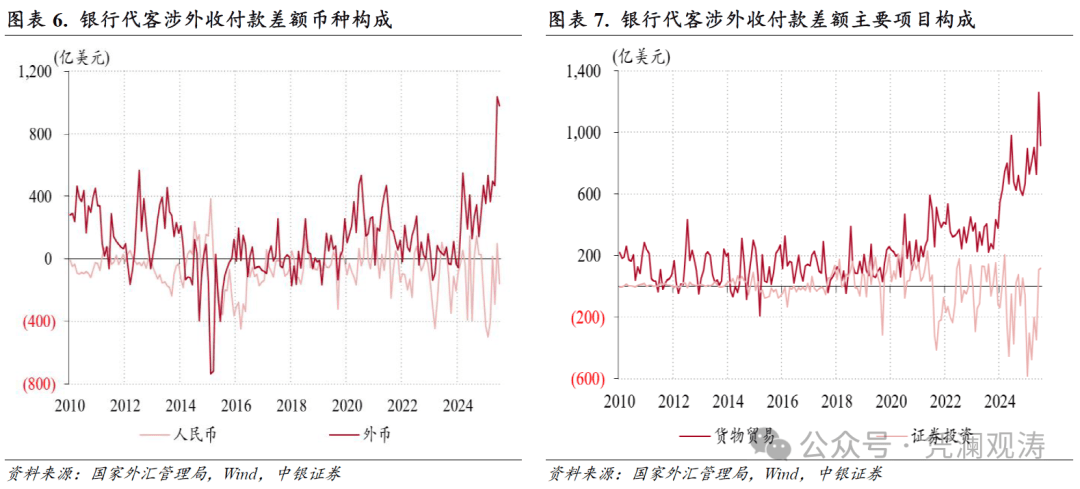 分项目看,货物贸易涉外收付款顺差环比减少344亿至915亿美元,为历史第三高,直接投资、服务贸易涉外收付款逆差分别增加32亿、19亿美元,分别贡献了银行代客涉外收付款顺差环比降幅的110%、10%和6%;证券投资涉外收付款顺差环比增加7亿至115亿美元,为2024年10月以来新高,收益和经常转移涉外收付款逆差减少77亿美元,贡献率分别为-2%、-24%(见图表7)。