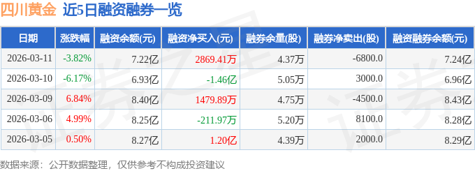 证券之星消息,截至2026年3月11日收盘,四川黄金(001337)报收于55.41元,下跌3.82%,换手率5.78%,成交量24.26万手,成交额13.57亿元。