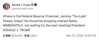 他在Truth Social上发文称:“美联储主席杰罗姆·‘太迟’·鲍威尔今天在哪里?他应该立刻降息,而不是等到下一次会议!”