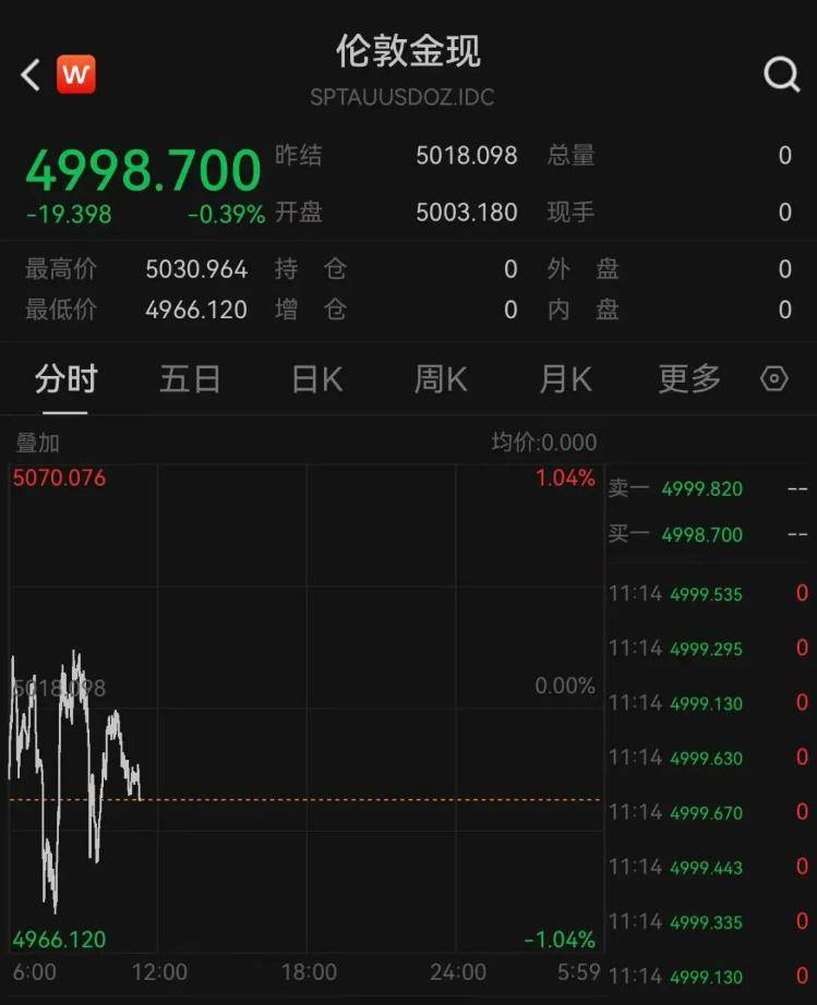 16日上午,现货黄金盘中三度跌破5000美元关口。截至发稿,报4998.7美元/盎司,跌0.39%。