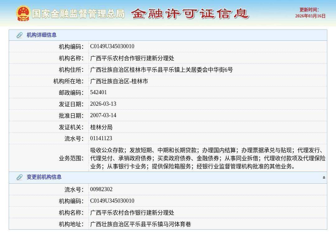 3月16日,根据国家金融监管总局许可证信息查询平台,广西平乐农村合作银行建新分理处换发金融许可证,发证日期2026年3月13日。