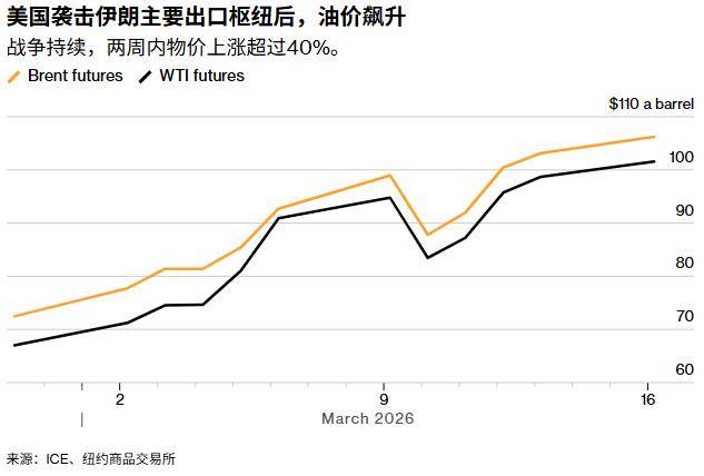 布伦特原油价格在过去两周飙升超40%后,当前交易价约每桶105美元,而WTI原油价格也逼近每桶100美元。美国对伊朗哈尔格岛军事设施实施袭击后,伊朗伊斯兰共和国随即对以色列及阿拉伯国家发起报复性打击。作为伊朗石油出口的核心枢纽,哈尔格岛承担着该国大部分原油运输任务。