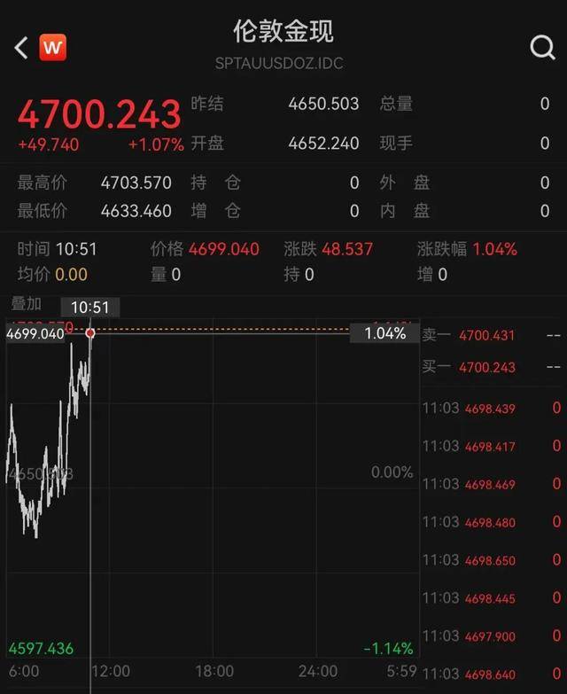 现货黄金重返4700美元关口上方,日内涨1.1%。