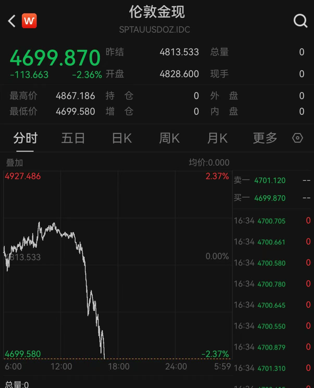 19日,现货黄金持续下挫,盘中跌破4700美元关口。截至发稿报4699.870美元/盎司,跌超2.3%。