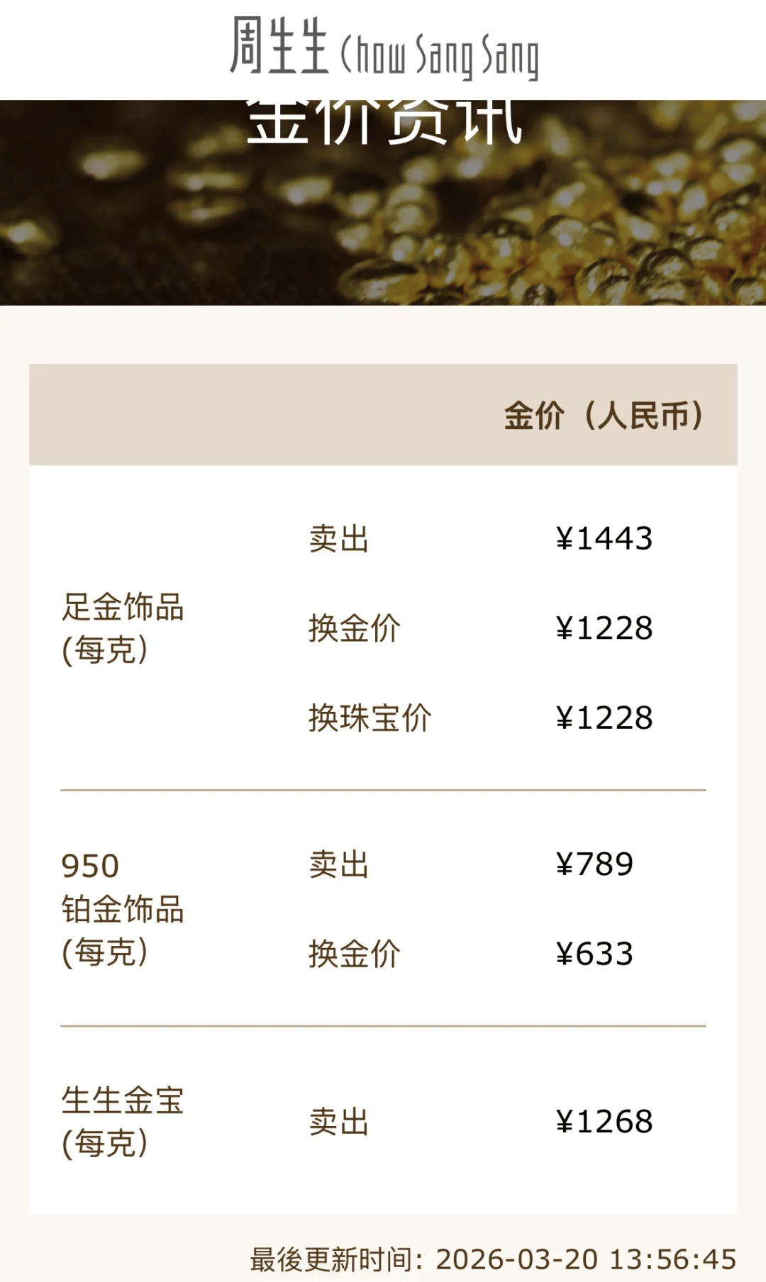 周生生官网显示,今日足金饰品价格为1443元/克,较前一日下跌49元/克,最近两日下跌104元/克。
