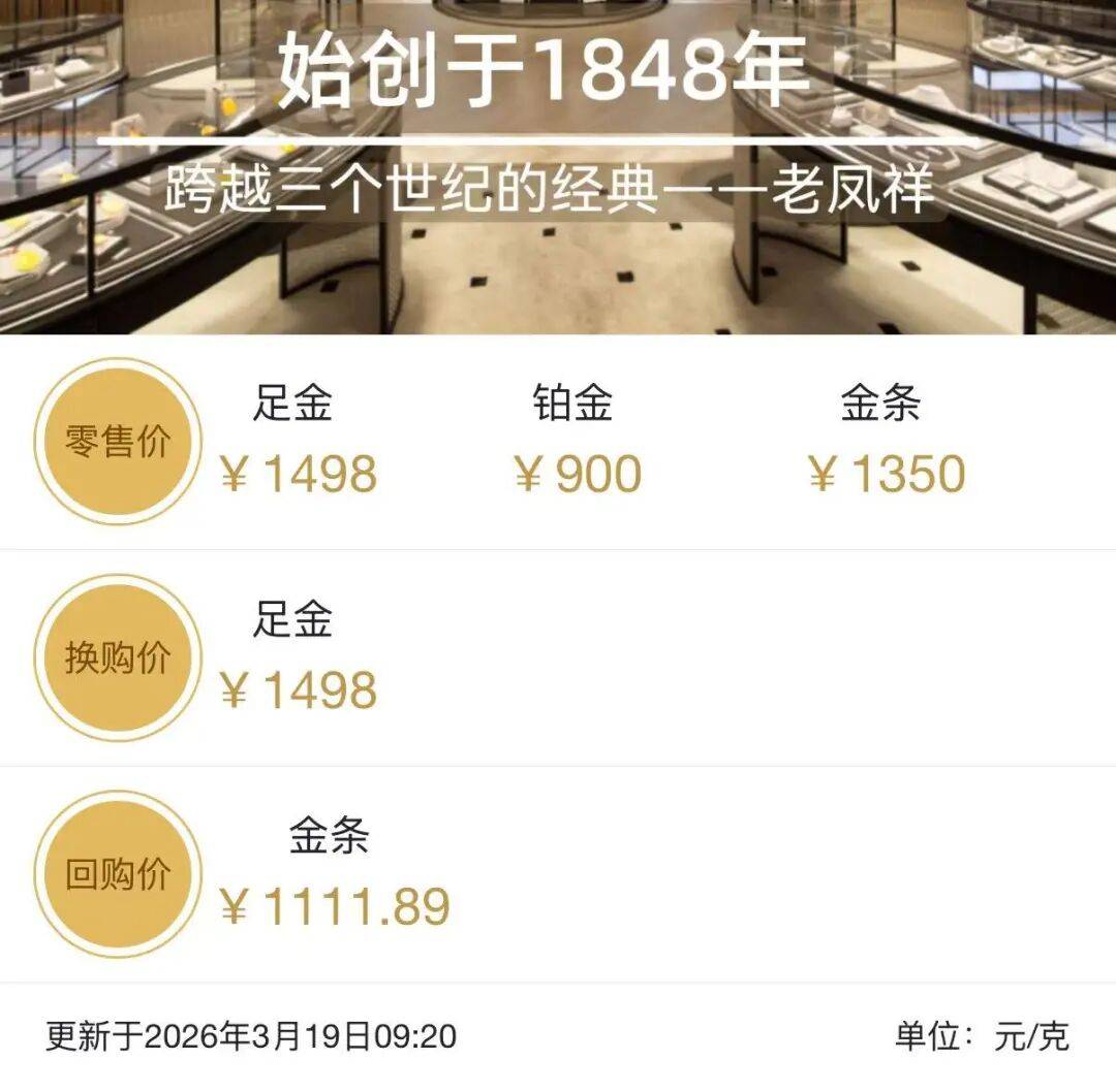 老凤祥金饰克价1498元,较前一日1540元/克的价格下跌42元/克。