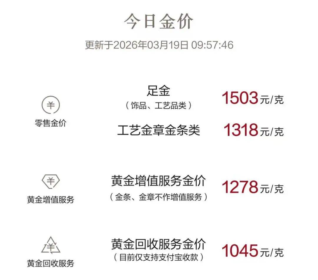 周大福金饰克价1503元,较前一日1551元/克的价格下跌48元/克。