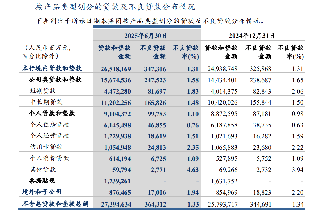 据公开资料,建行信用卡中心成立于2009年1月22日。截至2025年上半年,该行信用卡累计发卡1.29亿张,同比下滑0.77%;客户1.03亿户,同比下滑0.96%;信用卡总消费交易额1.30万亿元,同比下滑5.80%。报告期内,信用卡不良贷款金额为248.13亿元,同比上升33.45%;不良贷款率2.35%,上一年同期为1.86%,上升0.49个百分点。
