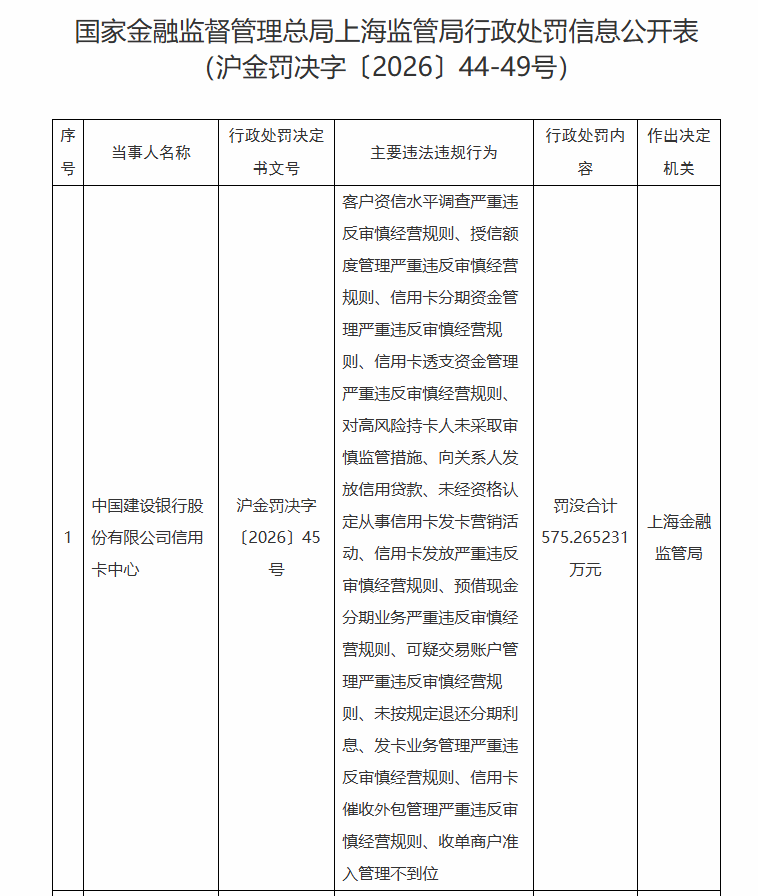 从客户准入到资金管理,从风险防控到外包管理,此次建行信用卡中心的违规行为覆盖信用卡业务全流程,均存在重大漏洞。上海金融监管局作出决定对其罚没合计575.265231万元。