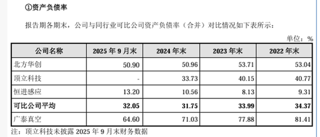又比如,广泰真空的资产负债率同样远高于同行。2022年末到2025年9月末,广泰真空列举的三家同行业可比公司资产负债率(合并)的平均水平分别为34.37%、33.99%、31.75%、32.05%,而同期广泰真空分别达到81.41%、77.88%、71.03%、64.60%,较同行平均水平高出一倍。